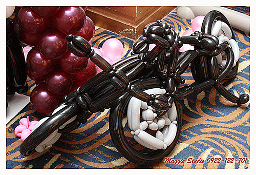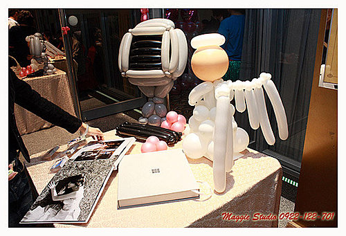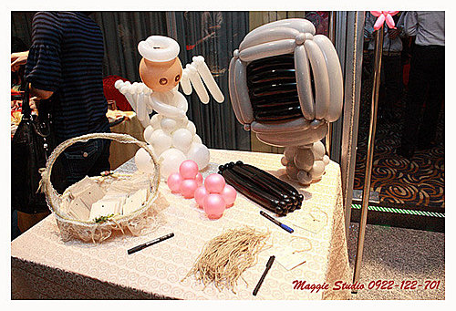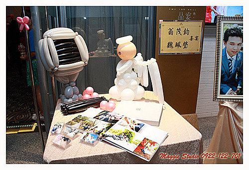 ▲婚禮場地在板橋晶宴,我忙完了佩瑩的造型才利用空檔拍了相片紀錄下來,這是會場入口處的佈置,旁邊這台徉裝衝浪板的推車也有用汽球佈置了一下。