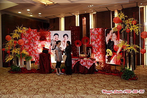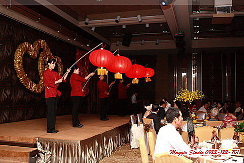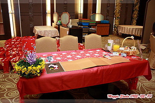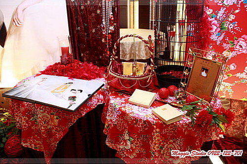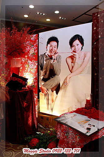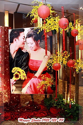 ▲入口處放置一個專區擺放新人的婚紗照,掛報等等,小V他們有請婚禮佈置,這次佈置的風格以中式為主,感覺上很特別也很喜氣,我還蠻喜歡這種風格的。