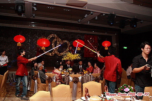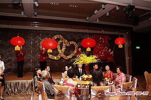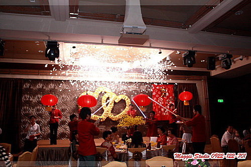 這次小V的婚宴辦在彭園,主要是地理位置的考量,方便雙方親友來參加,這倒是很貼心的一點。彭園的幾個據點我差不多都去過了,三重這家彭園也來過幾次了,之前來的感覺是新娘房好小間,場地不是挑高的,感覺有壓迫感,其實它有二個樓層,較高的樓層場地是挑高的,這次小V的婚宴席開五十幾桌,因此設席在高挑樓層,加上桌子擺進來,有種很有氣勢的感覺,新娘房也不一樣,空間大了三倍,缺點是沒有專屬的洗手間,新娘要上廁所就得和一般客人一樣排隊,不過大家看到新娘來總會禮讓一下,這也是台灣人的人情味,新娘總是最大的,呵呵~