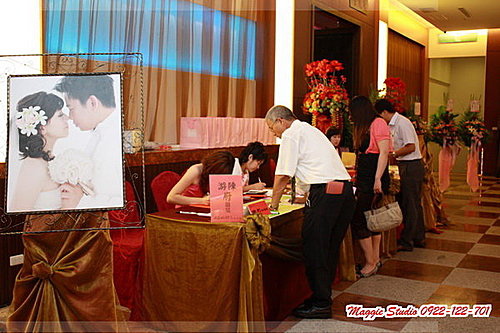 ▲收禮桌~這次並沒有請人特別佈置,但婚紗照是一定要擺的。