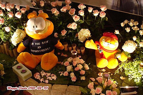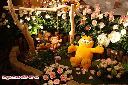 ▲現在的婚禮佈置多半是有主題的,可依新人的喜好去做整體的設計。淑芳最喜歡的加菲貓在盪鞦韆,真的太可愛了。光這些花材我想整個佈置所費不貲。