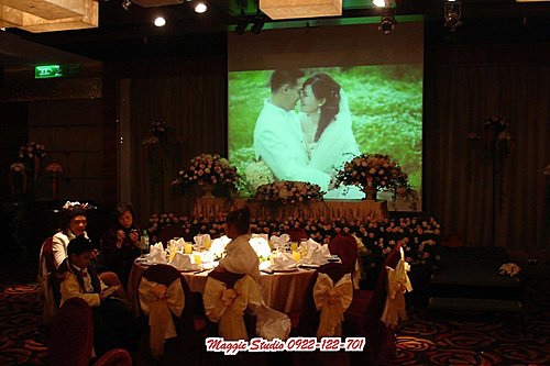 ▲佈置的美輪美奐的主桌,舞台的正中央有大型投影機可播放成長MV及婚紗照。連舞台都有鮮花佈置,整個會場是一片花海,浪漫至極!