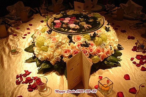 ▲主桌的擺飾,用粉嫩玫瑰花圍繞的水中燭光,感覺到浪漫和溫馨。