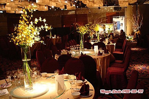 ▲進入宴客廳後可以看見像小庭院般的婚禮佈置,在許多鮮花的陪襯下,婚紗掛報中的新人更顯濃情蜜意。這樣的佈置基本上要場地夠大才能突顯特色,這個地方也可以讓一些親朋好友做為拍照留念的絕佳背景。